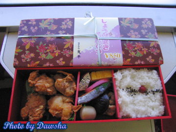 在火車上享用日式豪華便當的Tasi 與Fong
