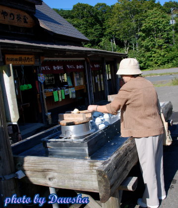 酸ヶ湯温泉小店裡好吃的蒟蒻,箭竹筍,黑輪,這一盤是日幣300丹