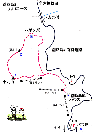 →(30分)→八平ガ原(20分)→(30分)→高原ハウス(高原屋)-霧降高原ハウス(第1リフト乗り場)-霧降高原バス停車場