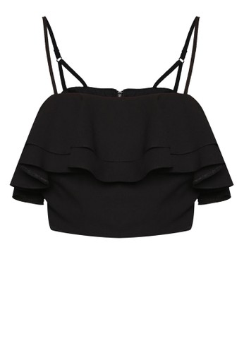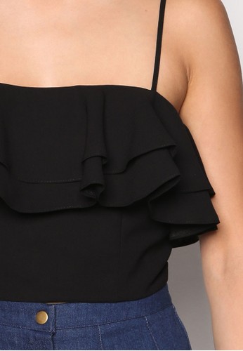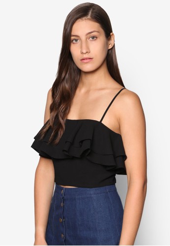 TOPSHOP 的雙荷葉層次短版細肩帶,採雙層荷葉飾設計,配以鏤空細節雙細肩帶,設計簡約且性感俏麗。