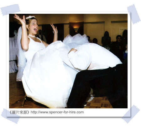 有機會參加美國人的婚禮的話,一定會對他們民族性中熱情與奔放的特質留下深刻的印象。雖然他們婚禮的儀式部份一般來說同樣十分莊嚴,典禮後的婚宴卻十分瘋狂。新郎與新娘大跳勁舞,互砸蛋糕的大有人在。不過整個婚宴節目中最引人期待的應該屬於新娘向未婚女賓丟捧花 (bouquet) 和新郎向單身男賓投襪帶的部份了。因為新郎必須將新娘的禮服掀開,以取得綁在她大腿上的襪帶,現場來賓當然一陣騷動。有些節目主持人 (The Master of Ceremonies,簡稱 MC) 故意惡整新人,要求新郎不得用手取帶,使得觀禮賓客更是興奮地尖叫連連。