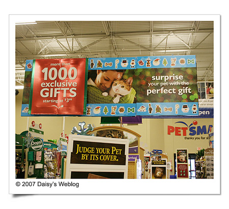上個禮拜我帶女兒到這裡著名的寵物連鎖店 Petsmart 看她最愛的小動物時就有如此的感觸。一個偌大的廣告看板寫著: Surprise your pet with the perfect gifts! ( 用完美的禮物來給你的寵物一份驚喜! ),彷彿在說 : 「你不是買聖誕節禮物送給家人跟朋友嗎? 如果你『真的』愛牠,就不要忘了寵愛牠,送份禮物讓牠驚喜一下喔!」招牌下是一大塊賣有紅衣、紅帽等各式各樣寵物禮品的特區。