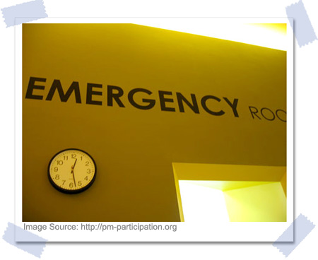 二天前開始,聶先生的病痛情況更甚,白天坐臥困難,夜裡輾轉難眠。今天凌晨被聶先生從客廳裡傳來的哀叫聲吵醒後 (註1),我要求他馬上赴醫就診。熬不過連日來的劇痛煎熬,他終於答應了。輕輕地把熟睡中的女兒喚醒,又隨手抓了裝有女兒平日出門時的必需品的媽咪包後,我們就匆忙上路,開車直奔醫院了。