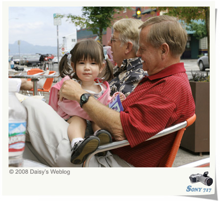 站在這一群清一色是未曾謀面的遠房親戚當中,我這張唯一的東方臉孔顯得些突兀。不善閒談的舅媽 Martha、聶先生和小姑杵在一旁,顯得手足無措。為了不讓別人嫌聶家的媳婦孤僻,我只好撇下我內向的夫婿,抱著女兒跟著公婆四處打招呼問候。其間公公向一位任職校長十六年的遠房親戚介紹我跟加恩。公公告訴她,加恩年紀雖小,卻已懂得二種語言,讓他們十分引以為榮。並且因為她的關係,他們全家上下都跟著學了一點中文呢! 說著說著,公公還興致勃勃地表演了他的『學習成果』,十分可愛。