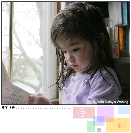 這些日子加恩的語言表達能力又有了一些小突破,在句子之間開始懂得使用合適的承接詞 (如「因為」、「但是」或「所以」)。因為看她對家裡的幾本中文童話書很有興趣,我最近開始用字卡讓加恩直接學習認一些字。有些令我驚訝的是,她對字卡的反應還不錯,讓我相信只要我們持續輔導加恩學習中文,這個孩子以後應該除了聽與說之外,還可以看得懂一點簡單的中文的。