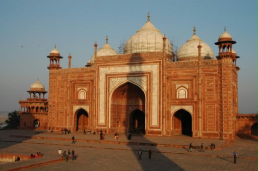 主體兩邊各有一座清真寺,也是為了取得與主體建築平衡的效果。清真寺以紅色砂岩建成,但仍有白色的圓頂,因此在形象上、色調上,都與泰姬瑪哈陵主體構成搭配、和諧。當夕陽時分,陽光輕灑在清真寺時,也別具韻味美感。