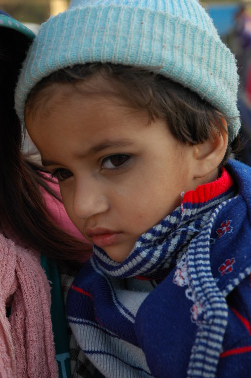 我拍下了這個小男孩,他穿著屬於毘濕奴神顏色的藍色毛衣,上面的花紋簡單大方,又不失童趣的天真;他戴著一頂淺青色的毛帽,雖然印度的溫度並不冷,但父母怕小孩吹風,還是給戴上,可以看出父母的愛與用心。