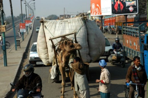 第一次在印度看到載貨的駱駝,都一定會嚇到:可憐的這隻駱駝,背後架了一「輛」簡單的木板車,上面裝載了幾乎是駱駝五、六倍多的貨物。那模樣,你會擔心這隻駱駝承受得了嗎?