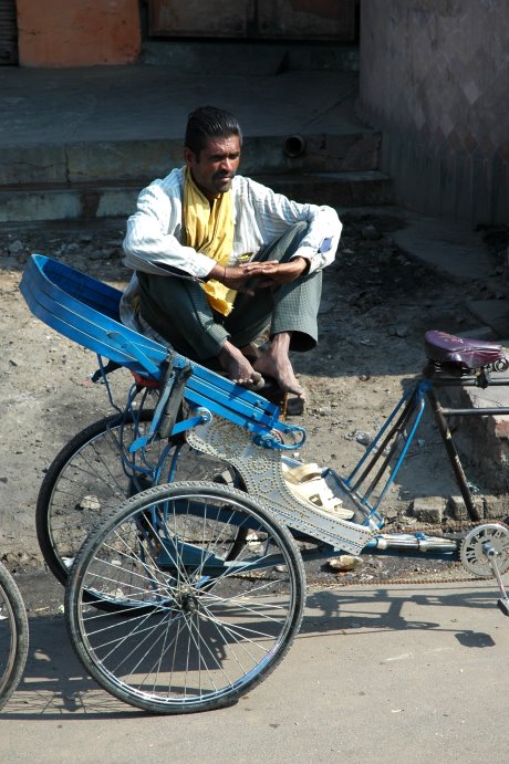 三輪車閒著,車伕也跟著沒事可做。印度人生意頭腦不像台灣人,總為賺更多錢忙著拉客。在印度,一天中沒半個客人上車,似乎無所謂。