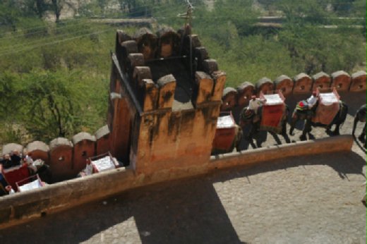 約莫早上八、九點,琥珀堡下入口,早有世界各地觀光客蜂湧而至,他們排著長龍的隊伍,等候騎乘大象上山。人之多,順利登上象台,騎上大象,大約要花十幾分鐘的時間。