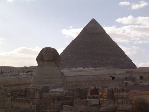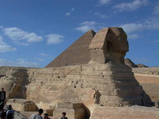 昔日宏偉的「人面獅身像」,在六百多年前遭反對偶像崇拜的回教徒破壞,鼻子、眼部均受傷嚴重。加以風沙侵蝕、戰火凌襲,「人面獅身像」殘破不堪,徒留威嚴、巨大的身影,震憾世人。