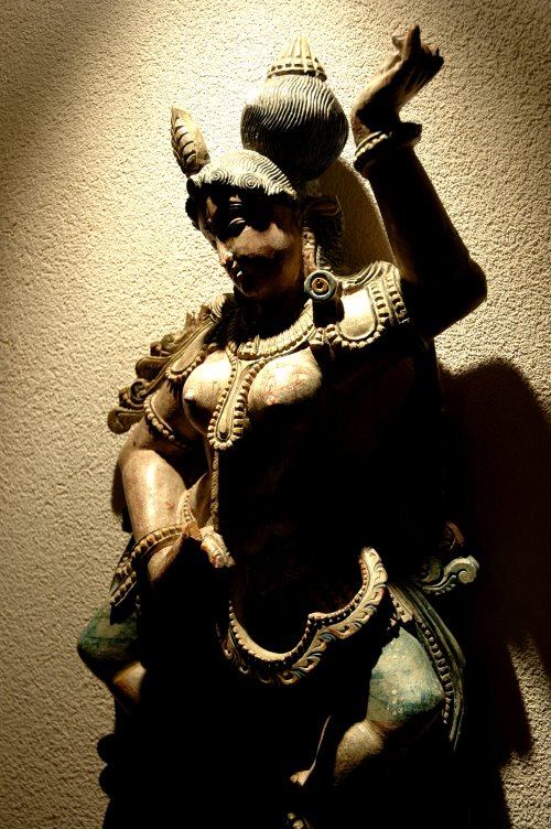 通常,女性雕像也會著重在手臂、腿部、腹部的肌肉表現,和乳房一樣,均飽滿豐潤。然而,印度的豐腴又絕不是遲頓的,而是靈活的。從這件女神雕像的手指,很清楚看到手部的柔軟,手指宛如蓮花出塵一般,輕佻而具魅力。大概,這就是屬於印度的美吧!