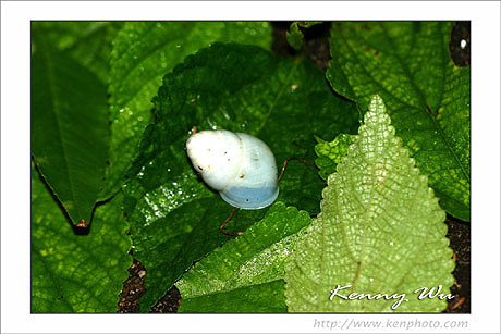頭有觸角二.腰身及外殼均呈白色與一般之蝸牛不同.