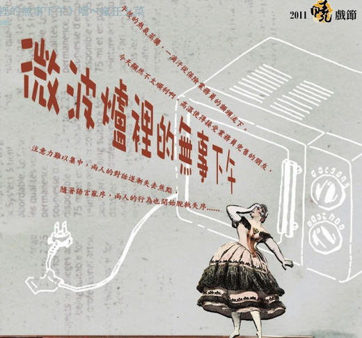 社會學家高夫曼(Goffman)有個劇場理論,說明所有的生活情境都像劇場一樣,有前後台之分,早上起床刷牙變身衣冠禽獸的前置作業是讓你在後台準備,踏上教室辦公室的前台,演出人人都希望你該有的角色。曉劇場《微波爐裡的無事下午》打破前後台的界線,邀你進入台北市萬華區小巷小弄裡的曉劇場,和梳妝好的演員來個閒話家常,喝杯冰涼、玩個咪爪(五隻貓滾來滾去好誘人唷),讓觀眾知道藝術家也是能說人話的(君不見演員的濃妝下也是親切的平凡人嗎),然後貓咪關好、演員就位,曉劇場正式開麥啦。