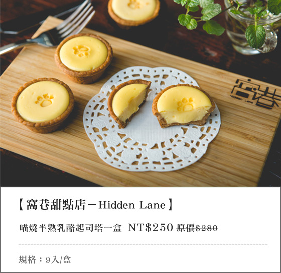 商品訊息簡述: 外帶:只要250元即可享有【窩巷甜點店-Hidden Lane】原價280元喵燒半熟乳酪起司塔一盒(9入/盒)?