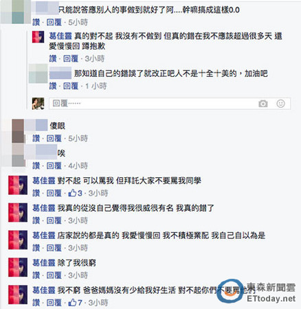 該爆料PO出後引起不少討論,葛佳靈事後也在臉書回覆留言道歉,也說自己真的知道錯了,「店家說的都是真的,我愛慢慢回,我不積極業配,我自己自以為是,除了我很窮,我不窮,爸爸媽媽沒有少給我好生活,對不起你們不要罵他們。」她說自己不是一開始就死皮賴臉不付錢,也沒有要裝可憐,她道歉:「對不起,我真的不該自己十天內內沒辦法發文還敢說要合作的。」