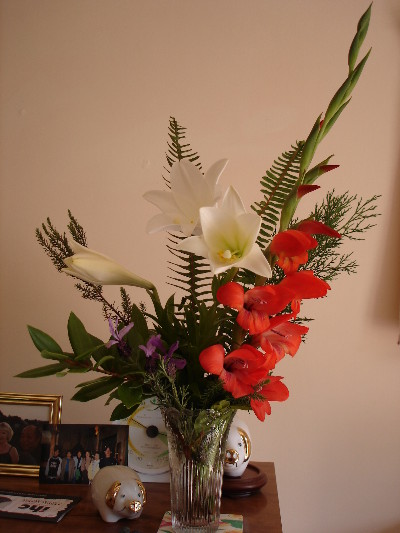 劍蘭和白色香水百合一枝枝的綻顏盛開