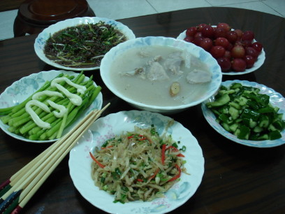 這頓晚餐,醬爆肉沒處理好,起鍋後稍一冷却就出汁了,而且過鹹;大失敗。榨菜本身除了鹹,不辣不香,連蒜薑葱末都沒提升它的香味,大失敗。只有大家都會做的燙蘆荀及格,噢,湯很棒!老燕子帶來煎過的大芋頭在乳白湯中和蘿蔔一起,超級美味。小黃瓜尚可。
