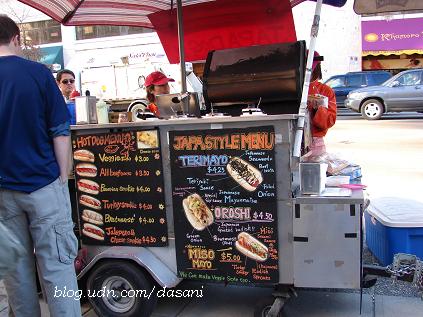 上週末跟五個朋友開車到溫哥華遊玩,其實主要的目的還是找好吃的料理。美式熱狗的吃法就是長條軟麵包(hot dog buns)中間夾著熱狗,然後熱狗兩邊加上洋蔥和醃黃瓜等等的醬菜,最後擠上美乃滋、番茄醬和黃芥末等等的醬料。Japadog一聽就知道是日本(Japan)來的。這個熱狗攤於2005年在溫哥華開業,吸引了各式各樣的顧客。出發前在旅遊導覽發現的,可是忘了抄下地址。我們六個人在市區問了半天都沒有人知道在哪裡,應該說我們問到的很多都不是溫哥華本地人吧!我們不死心,回到旅館上網終於查到地點在Smithe and Burrard的角落,忍了一個晚上第二天一口氣買了所有的招牌熱狗。哇!日式美乃滋、海苔、照燒醬、醃蘿蔔、豬肉熱狗、苜宿芽等等全都出現在熱狗上面。我最愛吃的是有醃蘿蔔和豬肉熱狗的Oroshi熱狗,一口咬下去滿滿的肉汁和醬汁,找這麼久真是值得了。溫哥華華人多,所以這種亞洲式口味的熱狗接受度很高,很多不是亞洲人的觀光客也因為旅遊導覽慕名而來。此外,我也看到很多碰巧經過的旅人或路人被可愛的招牌吸引過來。除了熱狗好吃之外,服務人員也非常親切的跟客人用日語打招呼,一派日本作風。有機會到溫哥華,可以試試獨特的日式熱狗喔!