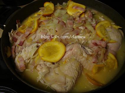 又是一道1/2法國人男朋友做的1/2法國菜。這道菜來自duck a l'orange的改版。醃料做法都一樣,不過他把鴨改成雞。因為食譜是用法文寫的,加上男朋友堅持這是他的食譜不准我偷走(其實是怕我學會以後他又不能做這道菜了),所以就沒有食譜可以貼了。不過我在一旁偷看,他把雞肉切塊用柳橙汁、柳橙切片、柳橙zest、白酒、百里香和月桂葉醃一個小時後,用培根油炒紅頭蔥和洋蔥,再把整鍋雞肉加高湯連醃料一起煎煮一個小時,最後用鹽巴和黑胡椒調味。這道菜我很滿意,嫩嫩的雞肉帶著濃濃的柳橙香味,讓我欲罷不能的吃了一大堆。下次應該要用鴨肉來試試,質感應該很不一樣。