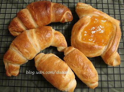 最近因為忙沒有時間煮菜做點心,老是吃外面。今天超市買的可頌麵包(Croissants)和義大利麵包都吃光了,沒時間出去買的狀況下,請出了麵包機幫我揉麵團。忙一段時間就去桿麵做個層次,亂忙一睌麵包也出爐了。自己做可頌可以調整奶油量,喜歡有口味的可頌也可以加個巧克力、杏仁醬或蔓越莓等等的。做了8個奶油可頌麵包後開始想要搞點變化。發揮創意我做了一個丹麥麵包(Danish pastry)中間放上apricot jam,另外也做了2 個法式奶油巧克力捲( pain au chocolat)。其實這個配方放2條奶油才會夠香夠油,可是自己做麵包看到2條奶油包在麵團裡實在是吃不下去,所以我把奶油減半。不過減半的結果就是麵包比較沒有那麼fluffy and buttery。今晚做了一大堆,我看接下來一星期早餐不用愁了。