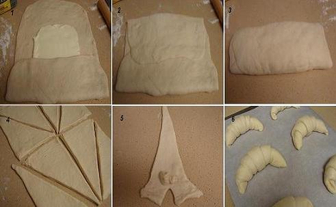 - 麵團桿成長方形後切成自己喜好大小的三角形。三角形底邊切一個小缺口,把缺口的麵團拿來墊在底邊,頂邊拉直兩邊往外慢慢捲成牛角狀。