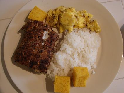 男友多年前旅行摩洛哥(Morocco)愛上了他們的食物。其實食材到哪裡都差不多,讓食物產生差別的地方就是香料的使用而已。這次特地調配摩洛哥香料來煎超市買到的新鮮halibut fillets。魚的兩面沾上香料之後用一大匙橄欖油兩面各煎約4分鐘,連鍋子(金屬把柄)一起放入烤箱375F烤約5分鐘就大公告成了。煮了這頓晚餐後整間房子都是香料味,到第二天上班回家都還聞得到。最讓我開心是男友猜到我做的是摩洛哥菜,看來我對香料使用越來越有心得了。除了用香料煎魚之外,還灑了一些香料在炒蛋(scrambled eggs)上面,讓炒蛋吃起來更美味。前幾天去一家高級餐廳吃3 courses for $30的晚餐,吃到了炸的polenta croutons,因為太美味回家馬上有樣學樣做了一盤。不過我是健康主義者,所以用烤的。有空再來介紹polenta croutons。