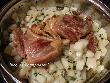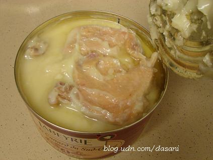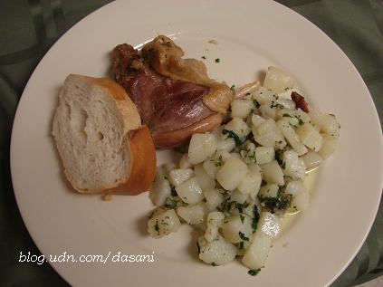 看了這罐來自巴黎的油封鴨腿(duck confit)罐頭足足一年了,今天終於有機會把它打開煮來吃。Confit在法文是保存(preserve)的意思。Duck confit是把用鹽和大蒜醃過的鴨腿用慢火煎煮到熟後和油脂一起密封保存,油封的鴨腿可以保存很久,要吃的時候再加熱,然後依照自己的喜好烹調。罐頭一打開,滿滿是油,看起來挺可怕的,可是聞起來滿香的。裡面總共有四隻鴨腿,我們煎了兩隻。另外我們用少許鴨油煎了一些加了parsley的馬鈴薯來搭配鴨肉。這次我們只把鴨腿煎熱,這種油封的鴨腿肉質有點像火腿,吃起來軟軟香香的,雖然封在油裡肉卻不油膩,不過因為鹽分很重,光吃鴨腿會太鹹。男友說雖然這種鴨腿又油膩又鹹,可是一小隻鴨腿就可以搭配一堆法國麵包和馬鈴薯,吃的油量和肉其實不大,所以法國人吃這類食物並沒有肥胖或健康問題。我們兩個把一大條法國麵包沾著油脂或搭配著肉吃掉一半,馬鈴薯也吃了一大堆。飽餐一頓後本來下班回來昏昏欲睡的我變得很有精神,我想應該是煮晚餐的過程很興奮第一次打開這種罐頭吧!