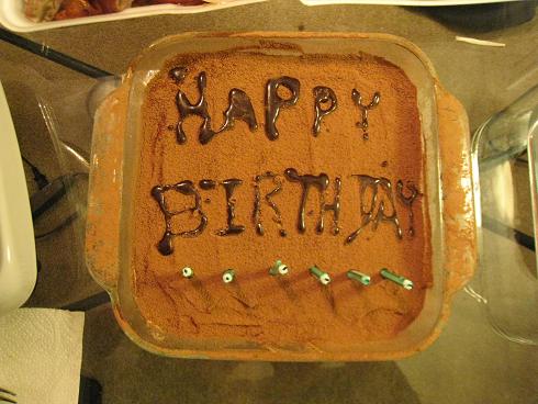 重頭戲來了! 跟Min認識也有十年了。十年來他吃我的手工點心和料理也有幾卡車了吧!半年前她跟我學了兩樣點心tiramisu和cream brulee,今天竟然用上了! 因為本週是我的生日,Min偷偷做了提拉米蘇幫我提前慶生讓我驚喜。我喜歡烤蛋糕幫別人慶生,自己生日卻不喜歡搞熱鬧。那種大家幫我唱歌的場面,真讓我很不好意思耶! 蛋糕照片要好好保存起來,這個算是十年友誼的紀念品吧! 下一個蛋糕不會還要等十年吧! 不管怎樣,真是感動啊!