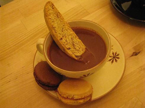 因為Min來西雅圖training的關係,我們到Sam家裡小聚。我很迫不及待跟大家分享烘焙心得,帶了macarons, biscotti, and Paris Brest。因為看到Parisian hot chocolate的食譜,手癢就當下煮了一大鍋跟大家來喝個high tea(下午茶) 。這種熱巧克力是用苦甜巧克力作成的,很濃很純很像在喝溶化的巧克力。搭配著macarons and biscotti真是人生一大享受啊!看似少少的茶點,一吃完竟然太撐,火鍋吃不了多少。Min在一旁哇哇叫準備很久的火鍋都吃不完。下次我會收斂一點啦! 不過這麼elegant的下午茶不是哪裡都有的喔!