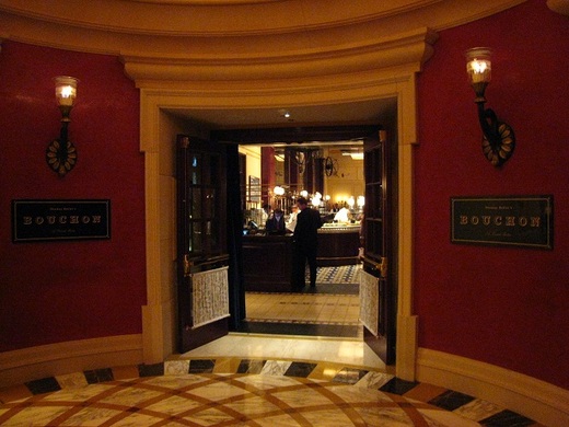 Thomas Keller 是個美國明星廚師,也是唯一一個擁有The French Laundry和Per Se兩間Michelin三顆星餐廳的美國人。他的幾本食譜書我也用了好幾年了,每次都沒有讓我失望過。一年前Thomas Keller到西雅圖參加新書宣傳活動,微軟總部的美食social group有機會請到他來公司簽書,我下午一開完會就往活動的cafeteria跑,整個人就是看明星的心情去的。大師一開場就拿手機拍現場人群,很幽默的說他從來沒想過會有一堆電腦工程師來看他,一定要好好拍起來做紀念。Thomas Keller本人很親切,言談舉止有一種很優雅的感覺,還和他的料理一樣滿有藝術氣息。男友看我興高采烈帶回一本有他親筆簽名的食譜書,跟我說他認識的應該只有我會拿到廚師簽名的食譜書可以高興成這樣。The French Laundry跟Per Se都還沒有機會吃過,不過來到拉斯維加斯當然不能錯過Bouchon。其實有Michelin一顆星的Bouchon在Napa Valley,拉斯維加斯的Bouchon在Strip上眾多Michelin餐廳中反而沒有那麼顯眼。不過我相信Thomas Keller對美食的堅持不會讓我失望,特地請明年二月即將結婚的高中同學和她未婚夫Jason來這裡吃晚餐慶祝。