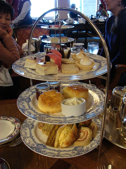 服務生先為我們送上草莓搭配現打鮮奶油,這裡的草莓非常新鮮甜美,讓我對下午茶點更有期待。茶葉我們選了empress blend,三層的茶點跟一般下午茶差不多有幾種三明治、scones和草莓果醬以及幾種甜點。因為食物實在太多了,甜點有2/3我們帶回去旅館晚上才吃。這裡的餐盤杯子都是custom訂製的,尊貴的花樣讓茶和茶點增添不少貴氣。第一杯茶加了牛奶和糖,嚐不出茶的味道。續杯後只喝純茶,這才發現茶的香味非常棒。三明治共有四種:煙燻鮭魚、小黃瓜搭配奶油起司、可頌水煮蛋和咖哩雞,每一種都很不錯,我最喜歡小黃瓜奶油起司三明治。鹹點還有一樣pâté crostini,法籍男友很開心吃到很不錯的pâté,不過裝飾的葡萄切片有點不太搭。English raisin scone真的是好吃的沒話說,奶油味非常濃厚,搭配現打奶油或是果醬都非常棒。甜點方面,檸檬塔算普通,沒有特別的驚奇。鬱金香形狀巧克力焦糖杯很有創意,巧克力品質很好。棋盤蛋糕周圍粉紅色糖霜用marzipan做的,蛋糕不錯吃,不過我不是很喜歡marzipan。Raspberry cheesecake看起來平凡無奇,吃一口才知道是整個下午茶的驚奇點。蛋糕裡面的起司和raspberry酸味恰到好處,周圍一層薄薄的白巧克力讓整個蛋糕味道提升不少。整個下午茶點食材和呈現方式都有精心設計過,加上細心的服務和窗外美麗的水邊景觀,伴隨著優雅的現場演奏琴聲,讓我整個人輕鬆愉快的享受美好的一餐。本來以為Empress Hotel的下午茶不過就是另一個所謂的觀光景點和噱頭,親自體驗以後覺得滿値得的。尤其我在品嚐下午茶中找到新的點心靈感,我想家裡應該很快就會出現我自己做的下午茶點。炎炎夏日在家或戶外喝茶吃點心應該是人生一大享受吧!