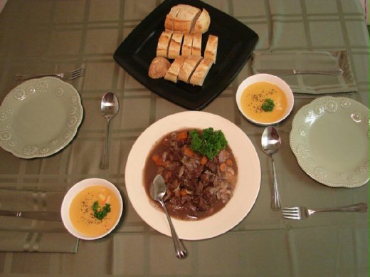 整道菜花了兩天時間。要燉肉的前一晚,先把牛肉、香料、紅酒、洋蔥和紅蘿蔔全放在大盆子裡面覆蓋保鮮膜放到冰箱醃入味。我個人比較喜歡很入味的牛肉,所以我會醃24小時。燉煮時間差不多三小時。如果是用來要請客的菜,記得要提早準備。法國麵包是主食。他們吃東西幾乎都可以用麵包來搭配。綿綿的牛肉搭配沾著醬汁的麵包還有美味的蔬菜,再來一口我熬煮了一個半小時的鮮蝦濃湯(shrimp bisque),真是一頓terrific的晚餐!在這裡貼上來跟大家分享,有興趣嘗試的朋友一定可以跟我一樣體驗到美食的滋味喔!