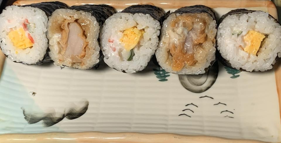 壽司米有酸酸甜甜的味道,蟹肉壽司裡的蟹肉和蛋絲味道沒有很濃郁,大多都是吃到美乃滋的味道。雞腿壽司有添加特殊醬料,近似於滷雞腿的滷汁。雞肉稍嫌硬了點,但是還是好吃的壽司。