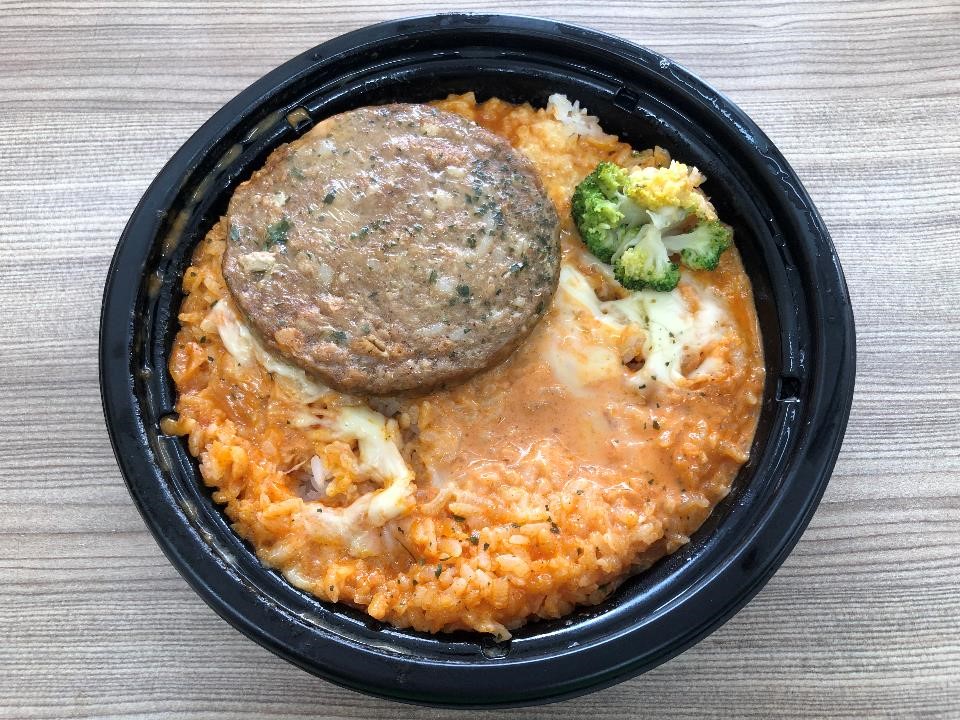 因為是燉飯所以米粒的口感偏軟,起司和乳酪沒有放很多,而所謂的"粉紅醬"吃起來甜甜辣辣的,算是一般人口味中的小辣。漢堡肉不像一般早餐店漢堡那樣偏軟,肉質是扎實的,雖然是組合肉,不過沒有加入太多灌水的添加...