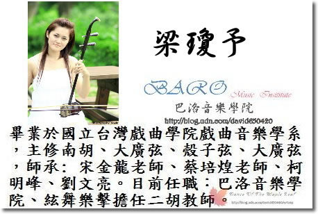 演出經歷: 2011年成立楓之舞樂團擔任二胡於小河岸留言演出。在校期間皆參予各<歌仔戲學系>實習演出及畢業公演,擔任二胡、殼子弦。 2010年 於佛光大學人文學院參加佛光大學十週年校慶演出「星空廣場音樂會」,擔任二胡、大廣弦。 2008年隨樂團赴澳洲布里斯本參與浴佛節大會演出。曾受邀與國寶級歌仔戲大師【廖瓊枝老師】封箱大戲《牡丹風華》於城市舞台演出,擔任文場伴奏。 2004年5月 於宜蘭傳統藝術中心演出「十二寡婦征西」,擔任二胡。 2004年5月 於大龍峒保安宮參加保生文化祭民間劇場/家姓戲演出「十二寡婦征西」,擔任二胡。