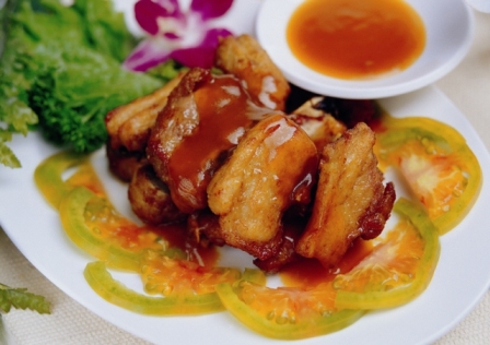 4. 鍋中留少許油,將調味料(鹽、橙汁、細砂糖)放入攪拌均勻後,再放入炸好排骨煮至入味,最後加入太白粉水勾芡即可。