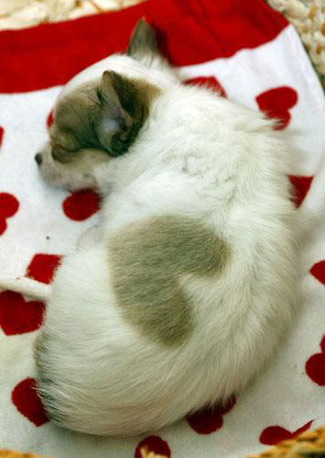 據英國媒體報導,這只吉娃娃是小公狗,出生在日本一家寵物商店,現在已經一個半月大了。它最與眾不同的是, 身上天生就有一塊淺褐色的心形圖案,而且圖案造型很清晰。襯著它渾身雪白的毛,非常醒目也非常漂亮。