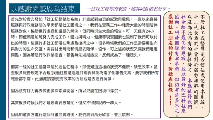 也感謝許多社工朋友的信任,目前我們這個系統公開4週來已超過1萬人次的訪問,每週產生約600-700份的紀錄與處遇計畫,也收到一些社福機構督導或社工系教授的對此系統的肯定與鼓勵。基於「AI公共化」的精神,此處我也照舊公開演講的錄影與投影片的內容,希望能讓更多社工朋友了解並放心使用我們免費公開的輔助系統。但更希望真能藉此機會拋磚引玉,期待還有更多資工技術或系統管理的單位一起加入(可以百花齊放),開發更多能協助我們社工朋友的資訊工具。畢竟,社工朋友代表我們社會,不辭勞苦地去關心陪伴我們社會最弱勢的族群,本不應該被沉重的文書紀錄等工作壓垮,反而應該得到我們社會更多的尊敬與更多的資源與支持,不論是在制度、薪資還是科技應用上。但是囿於我個人知識與能力不足之處,還請相關領域專家達人不吝指教。