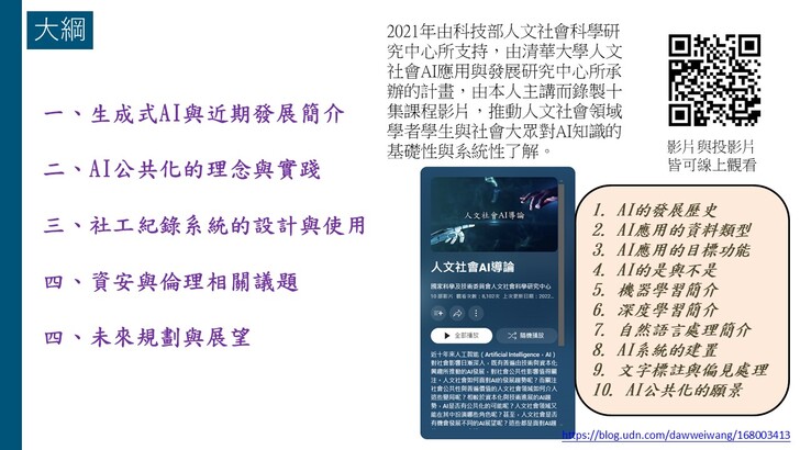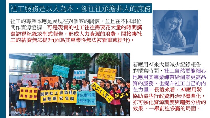 近年來AI的快速發展,幾乎影響每一個領域或行業。從強調「以人為本」的社會工作領域來看,這樣的AI工具又可能對社工領域帶來甚麼樣的影響與幫助。本次演講分兩個部分,前半段主要是從人文社會的角度簡介目前的AI原理、近期發展與未來對我們社會的影響。後半部分將以「社工紀錄輔助系統」為例(連結如下) ,說明AI可能如何協助第一線的社工人員節省紀錄撰寫的時間,讓社工專注於案主服務,間接提升服務品質。此系統支援錄音檔案上傳(含社工單向記錄、現場錄音或電訪錄音)並自動轉逐字稿;社工在選定紀錄的重點面向後,即可讓AI自動輸出符合社工專業的記錄初稿、專業評估並處遇計畫的建議。近期也將新增家系圖自動生成與社福資源AI搜尋整合的功能。此系統的AI模型採用Claude API,符合美國醫療等級的HIPAA認證,應可在保障個案隱私的基礎上成為社工人員在AI時代的創新解決方案。當天現場亦可開放試用並蒐集回饋意見。