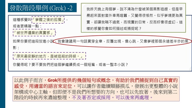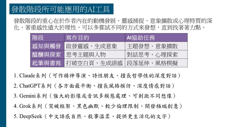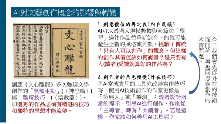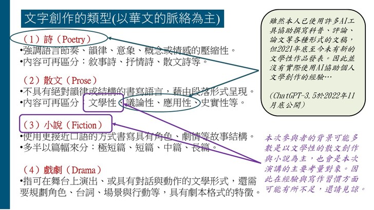 所以幾經考慮,後來還是答應下來。感謝創世紀文字培訓書苑的莫非老師邀請,也有讓她知道這是我第一次受邀分享AI在文學創作領域的應用。雖然深知自己對文學創作的了解與經驗都還非常膚淺,但既然這也的確是重要的議題,我也就勉強以一個業餘的文學愛好者分享若干想法,也請相關專業人士不吝指教。