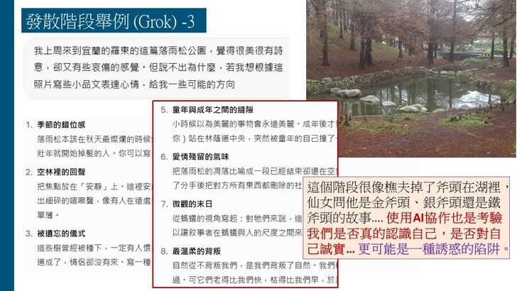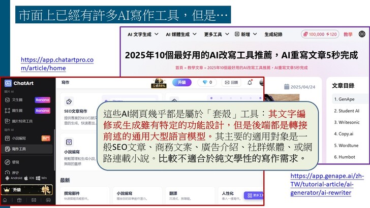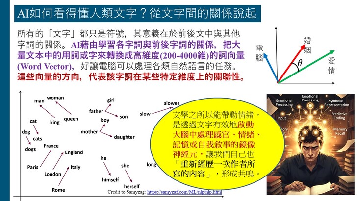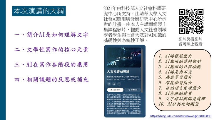 半年多前接到這次的演講邀請,心裡真的很掙扎。從私人興趣方面來說,多年前比較有時間的時候,我還是有些純文學的文字創作,多半是擬古詩詞、新詩或藝文賞析/評論類的文章 (可見於本部落格)。這幾年因為跨足AI相關的應用研究反而太忙,少有足夠的時間再靜下心來寫這些文學性的作品,更別說用AI協助。畢竟後者對我個人來說,文學性的寫作還是帶有許多個人的私密性質,有點不太情願再被AI干擾....。