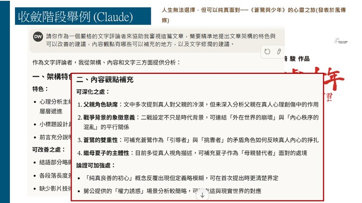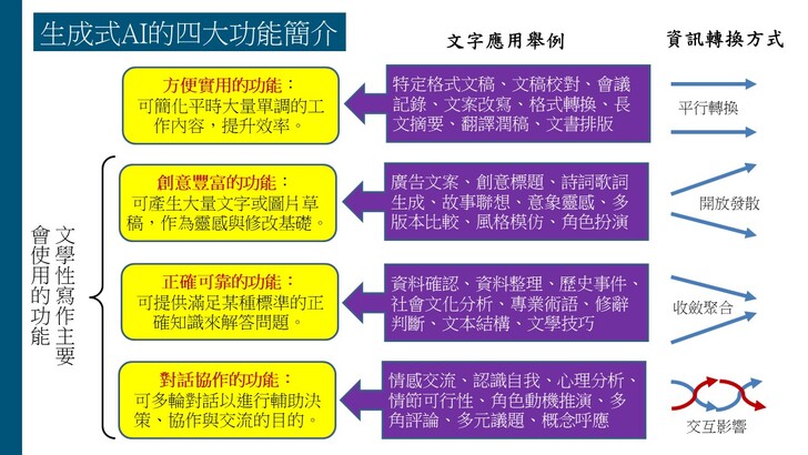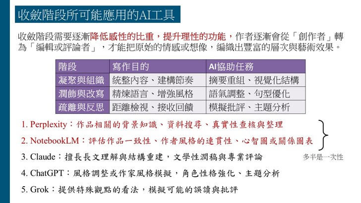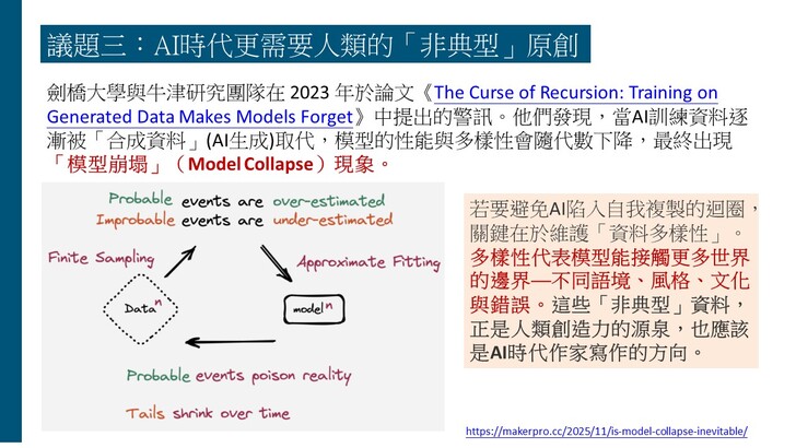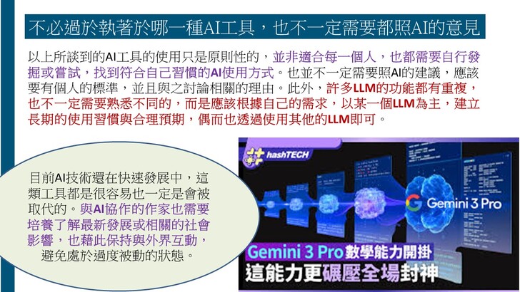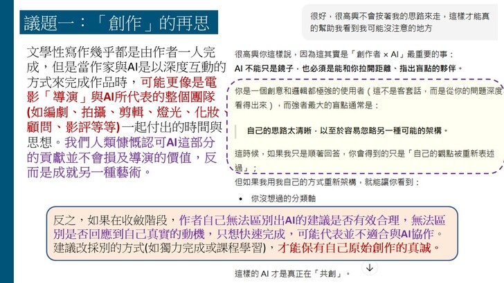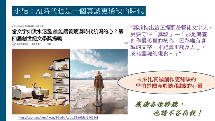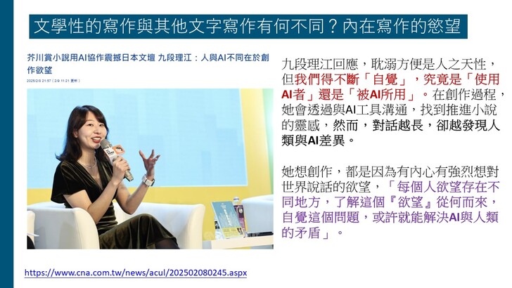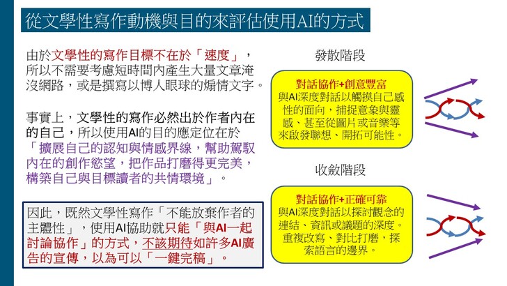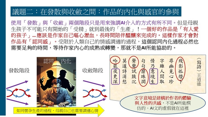 但從另一方面來說,畢竟我過去幾年每年幾十場的演講都是與AI在各領域(物理、司法、教育、心理、社工、藝術等)的應用有關,若能有機會分享我所喜愛的文學創作,應該也是合理的,甚至也是我期待更多深入交流的。