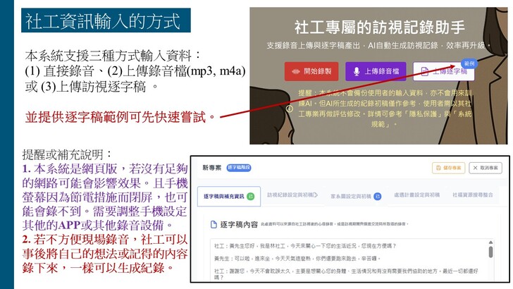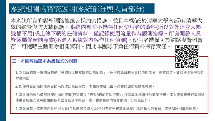 「AI社工紀錄輔助系統」之系統連結與其他關於系統的說明與更新資訊可參考以下