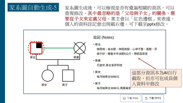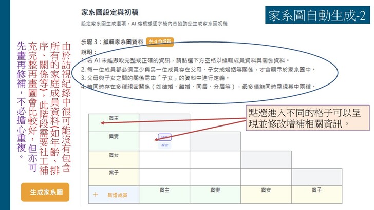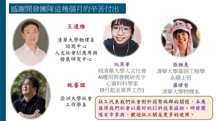 感謝台北婦女館的邀請,讓我們團隊有此機會分享「AI社工紀錄輔助系統」的設計理念、使用方式與相關倫理議題。目前已有五個AI輔助的功能:(1)訪視錄音轉逐字稿、(2)訪視紀錄生成、(3)處遇計畫生成、以及近日新增的(4)家系圖生成與(5)社福資源整合搜尋,使得這個AI社工輔助系統對社工訪視紀錄的協助功能可以更加完備。希望更多社工可以瞭解如何善用這個AI工具改善社工紀錄的品質與效率,進而提升社工服務的核心價值,增進助人工作者的尊嚴與意義。