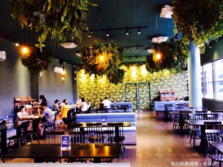 綠色的用餐環境,右邊透明窗是14層的垂直栽植空間