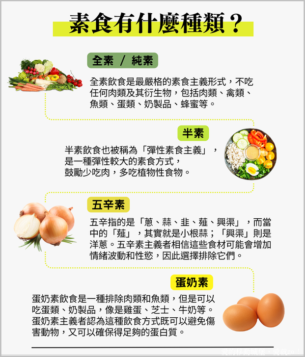 素食主要分為五種,包括「全素/純素」、「蛋素」、「奶素」、「奶蛋素」和「植物五辛素」;它們的主要區別在於是否食用蛋、奶製品以及「五辛」(蔥、蒜、韭、薤、興渠)。