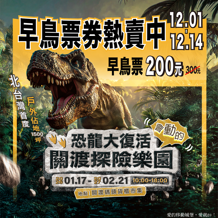 你準備好踏入侏羅紀公園了嗎? 全台年度最強親子話題展《恐龍大復活 關渡探險樂園》來嚕! 將於 2026 年 1 月 17 日至 2027 年 2 月 21 日在台北關渡碼頭震撼登場!佔地1,500 坪...