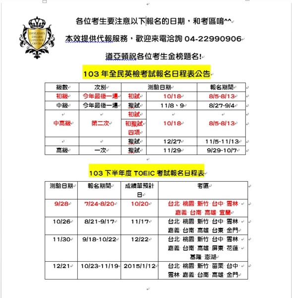 全民英檢和多益考試、報名日期