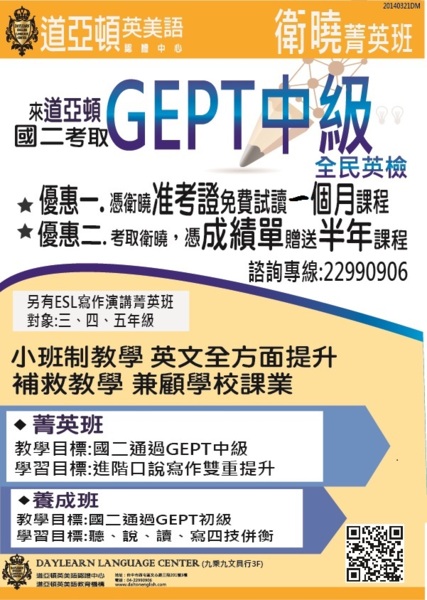 這個周末GEPT英檢和TOEIC多益,同步開考,你,準備好嗎? 想要提早考過檢定門檻嗎?來道亞頓吧,卓越的師資,完善的設備,幫助你考過證照,替自己的未來加分! 來電洽詢:04-22990906